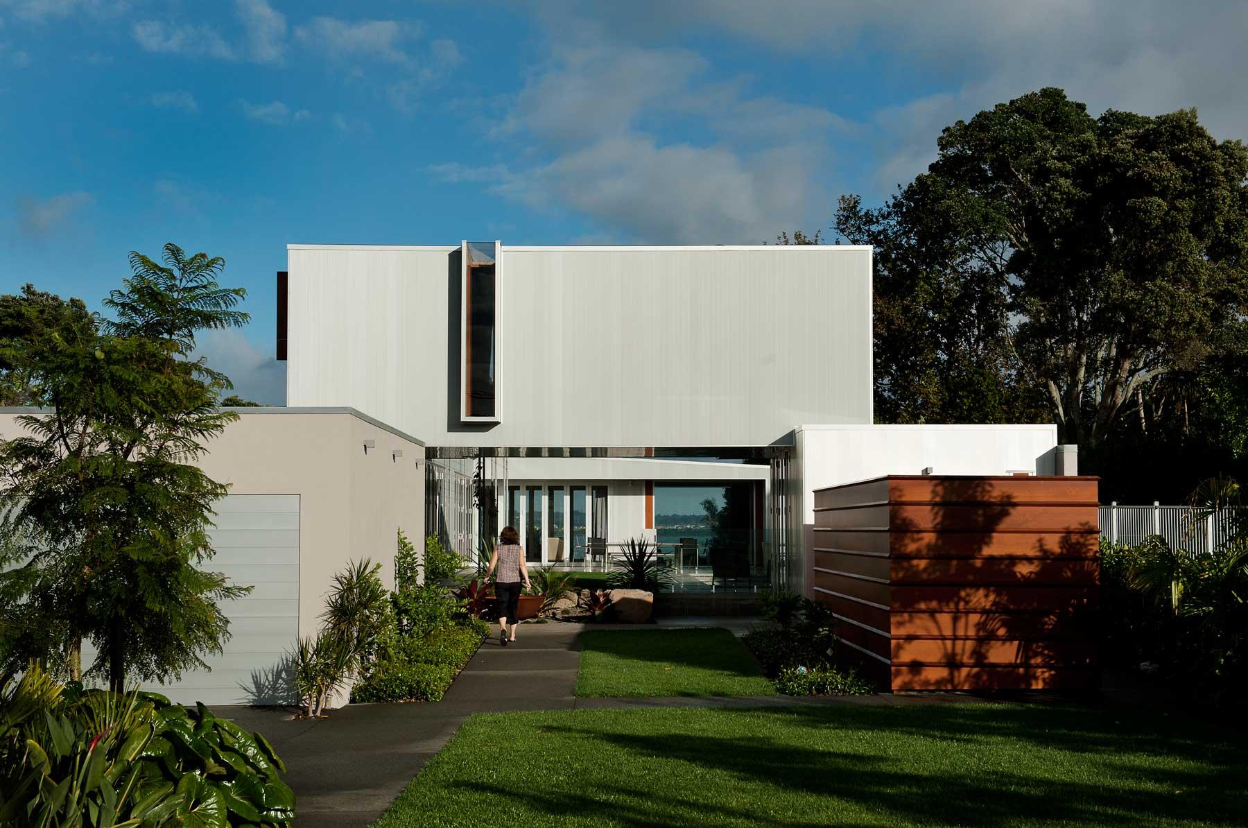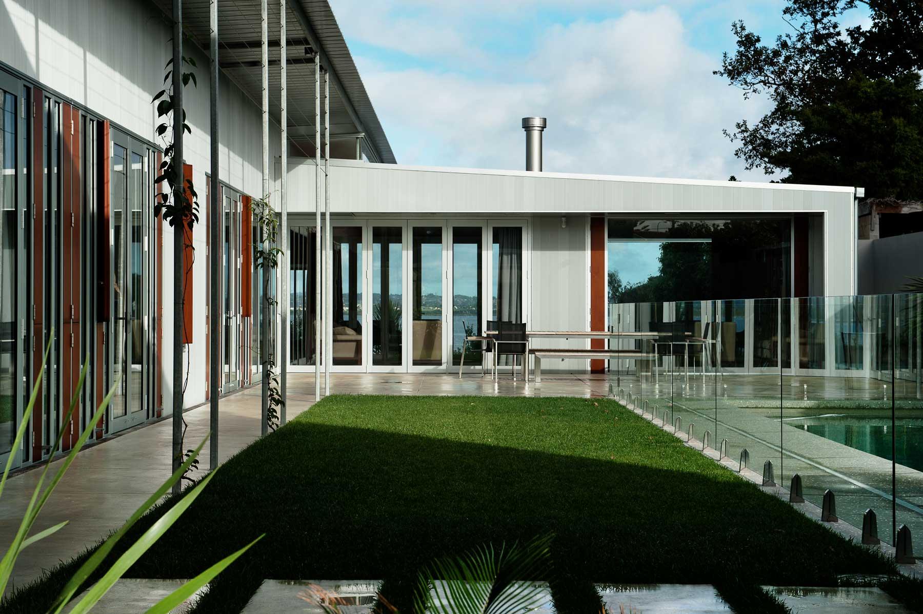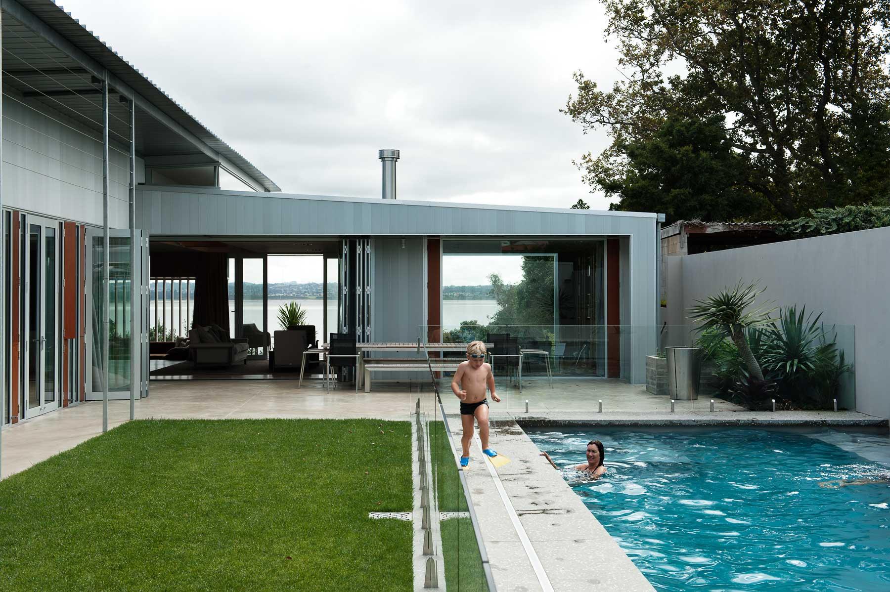 A home that sits above the majestic Waitemata Harbour, looking west over the Waitakere Ranges. A young family determined to nuture and treasure its growth by creating a rich courtyard with a pool and and entrance portal under the main bedroom.